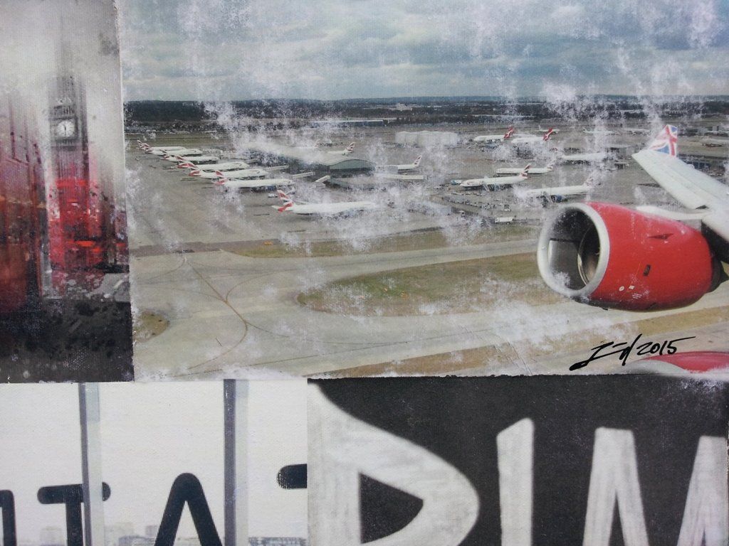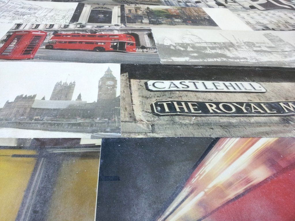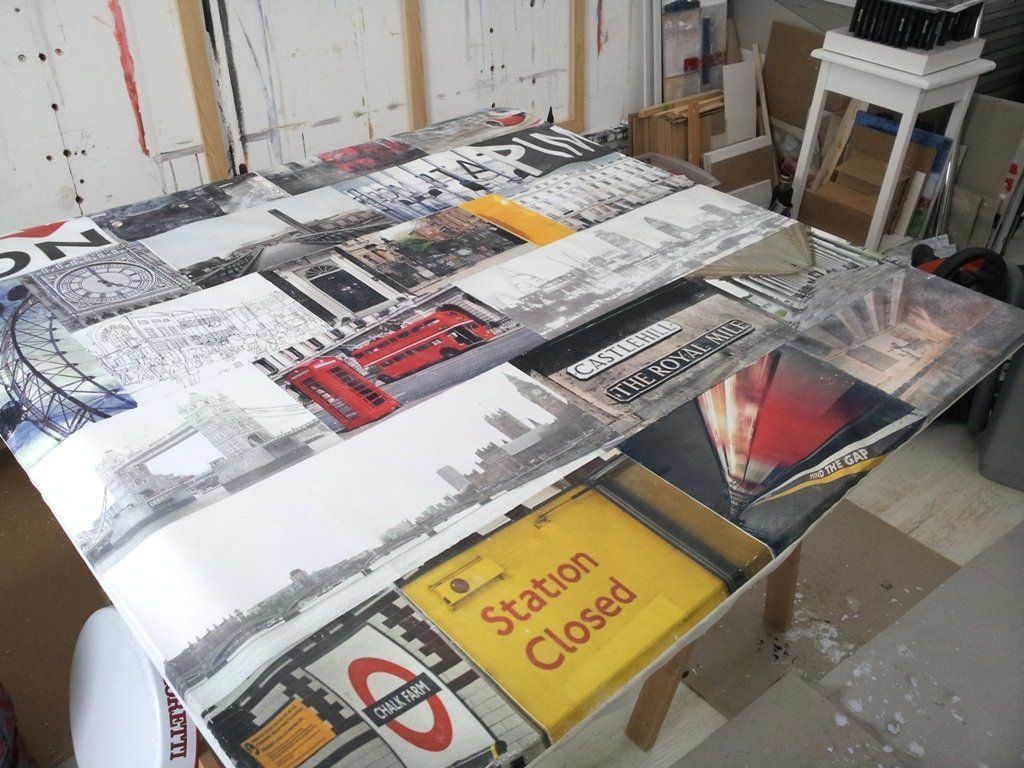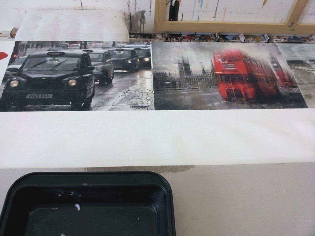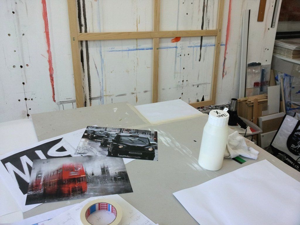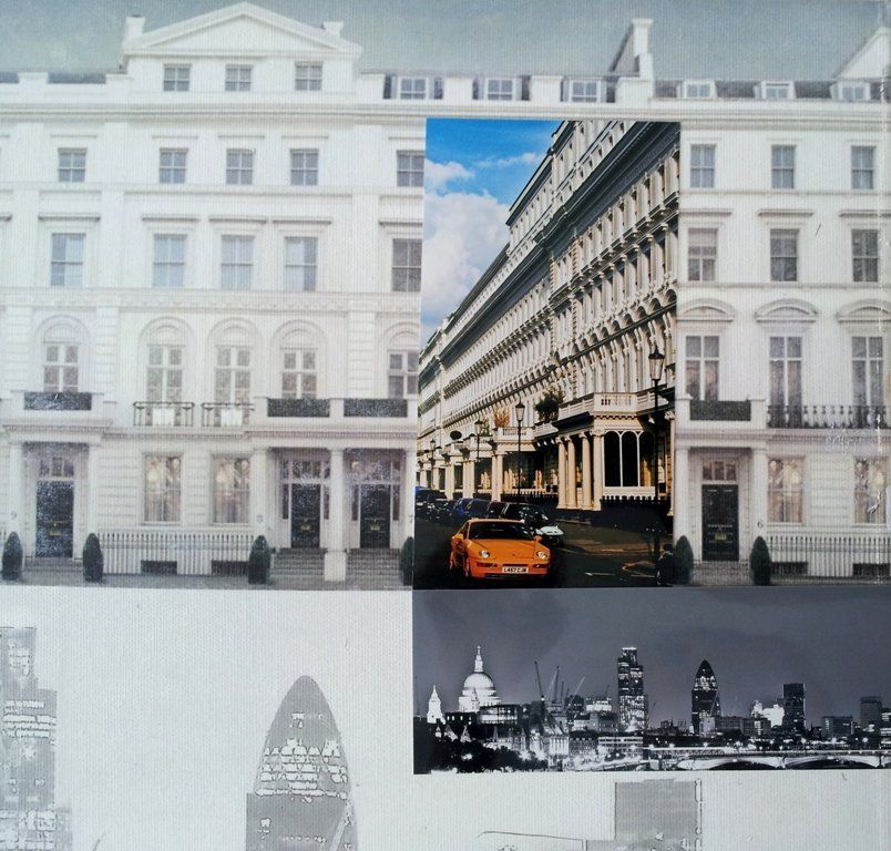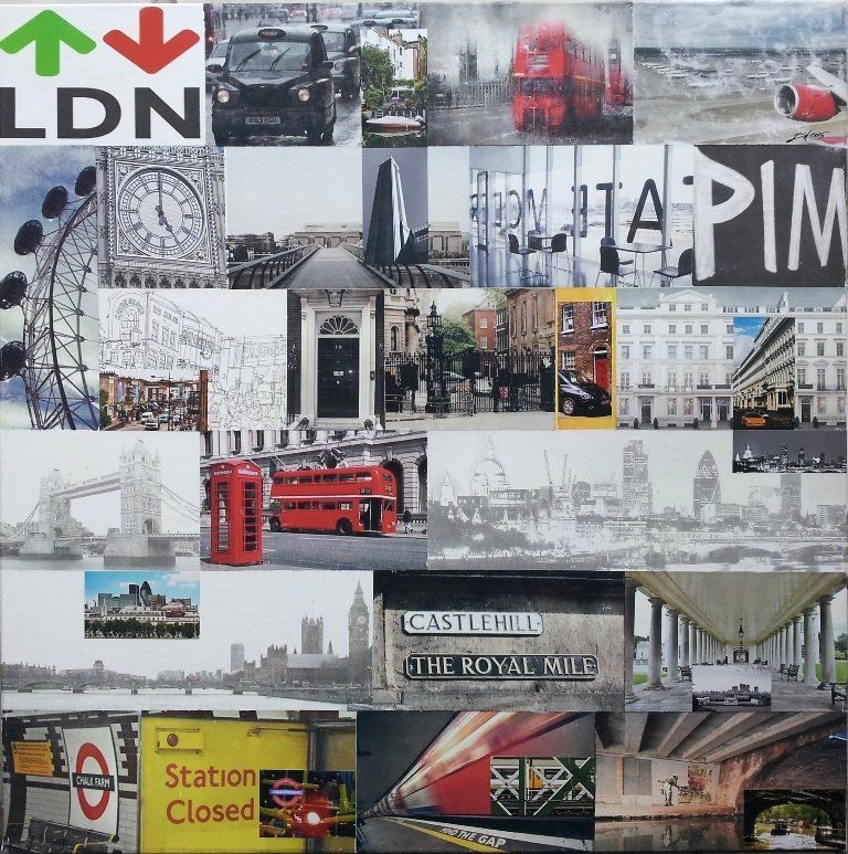 Bei dem Bild London [120 x120 cm] wurde nebst der Foto Transfer Technik ebenfalls mit Pinsel und Farbe sowie mit schwarzer Tusche gearbeitet. Die Herausforderung bestand hier, die einzelnen Foto-Tansfer so aneinander zu Reihen, dass keine Lücken zwischen den jeweiligen anstossenden Bilder entstehen. Das fertige Transfer Bild wurde danach, noch an einzelnen Stellen, mit SW- & Farb-Fotos ergänzt welche zu dem jeweiligen Abbild passen.