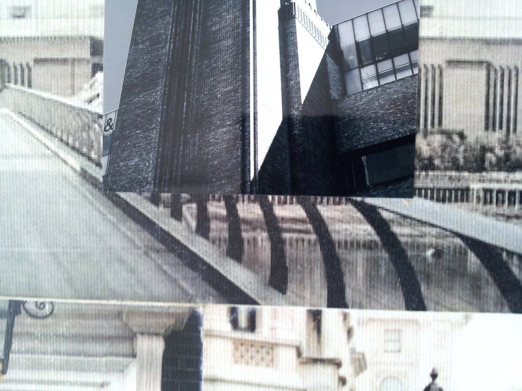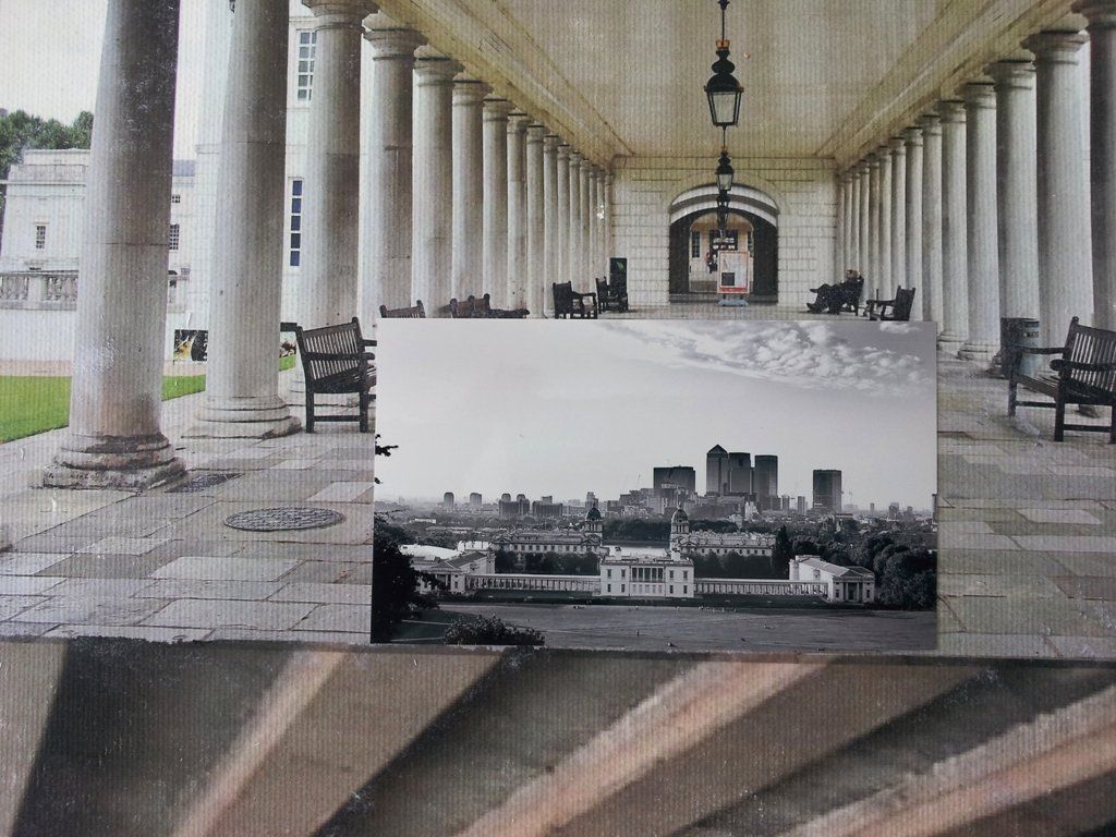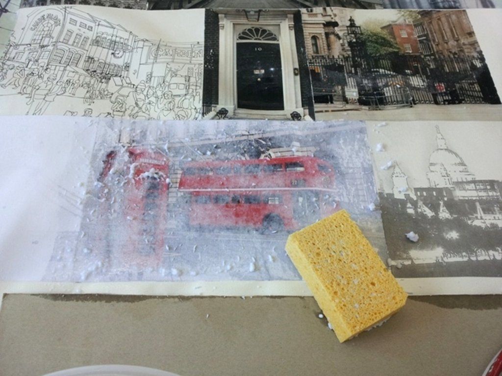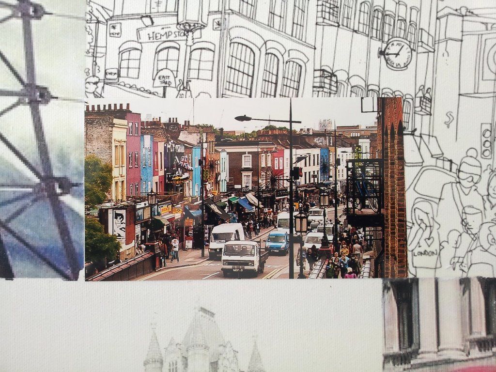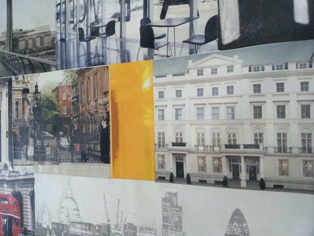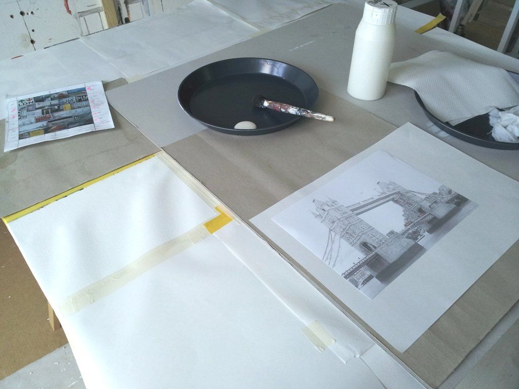 Bei dem Bild London [120 x120 cm] wurde nebst der Foto Transfer Technik ebenfalls mit Pinsel und Farbe sowie mit schwarzer Tusche gearbeitet. Die Herausforderung bestand hier, die einzelnen Foto-Tansfer so aneinander zu Reihen, dass keine Lücken zwischen den jeweiligen anstossenden Bilder entstehen. Das fertige Transfer Bild wurde danach, noch an einzelnen Stellen, mit SW- & Farb-Fotos ergänzt welche zu dem jeweiligen Abbild passen.