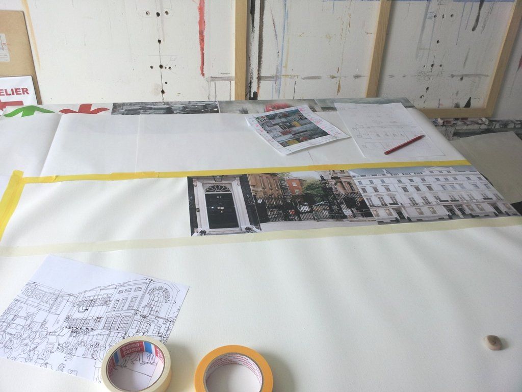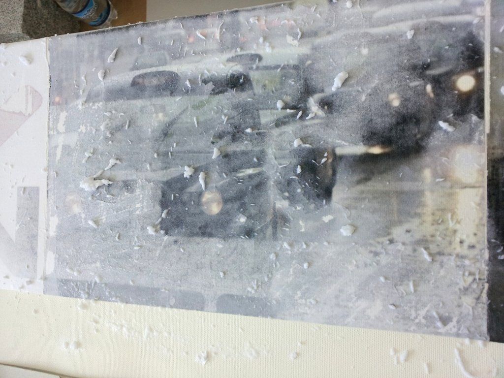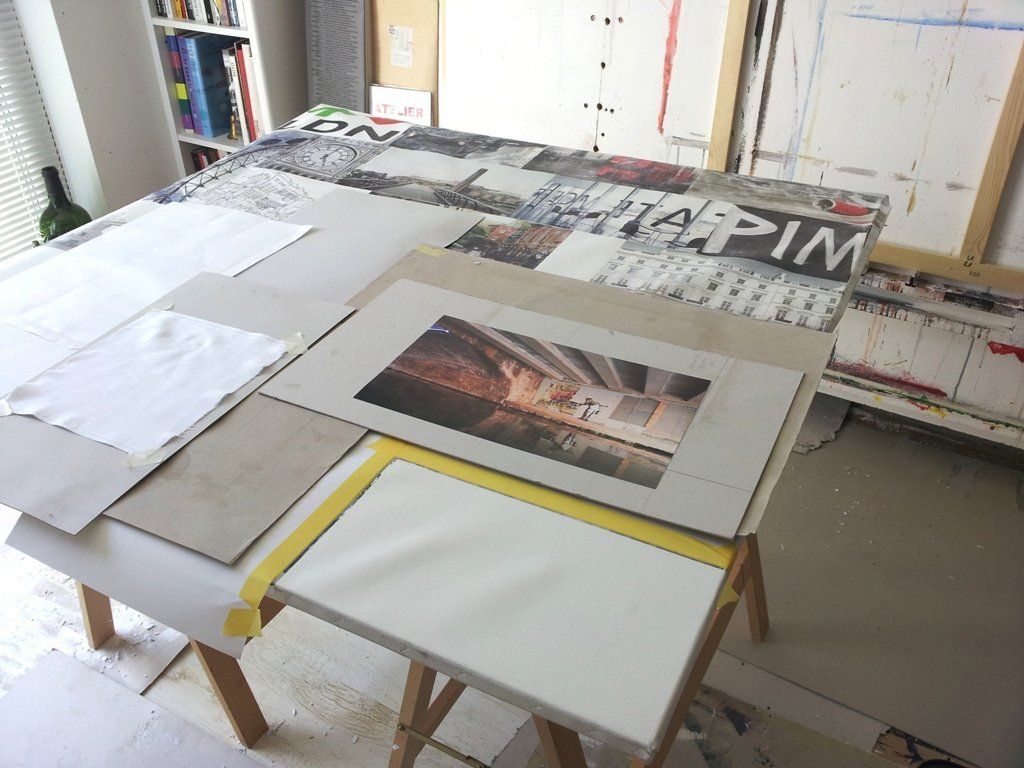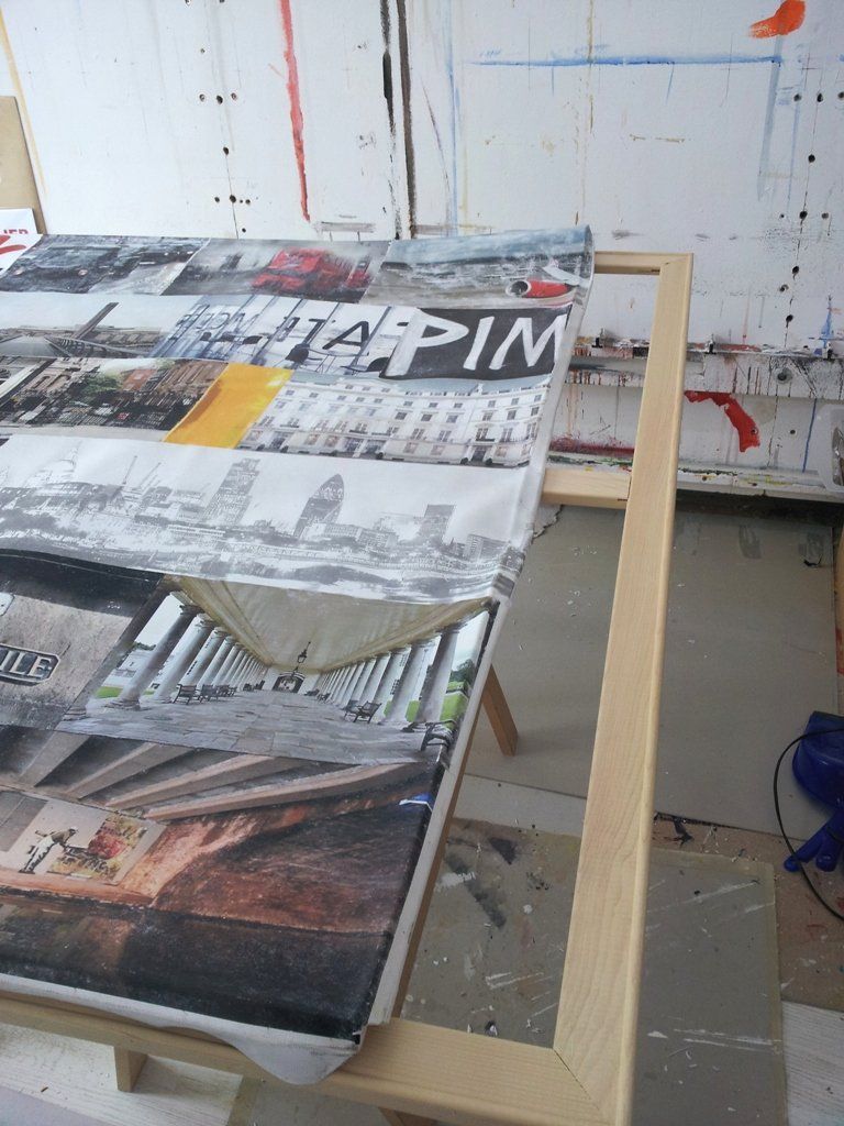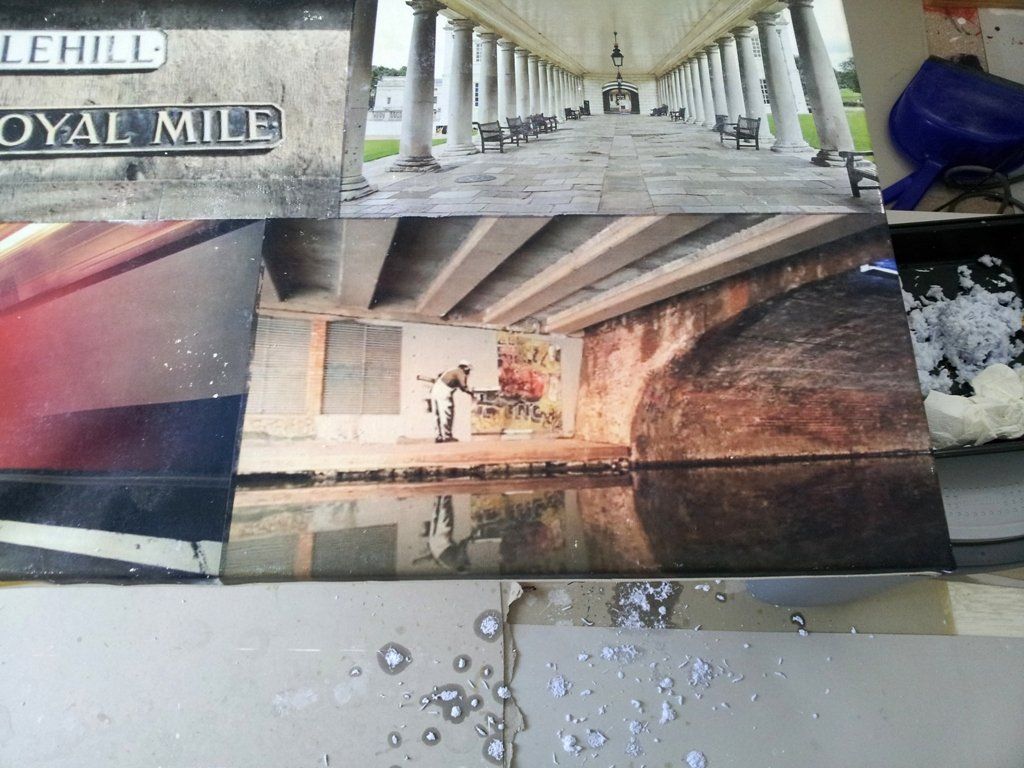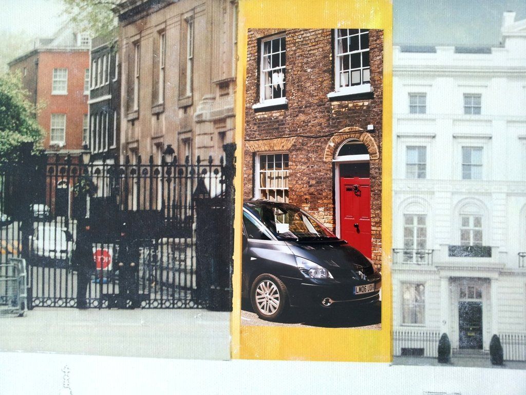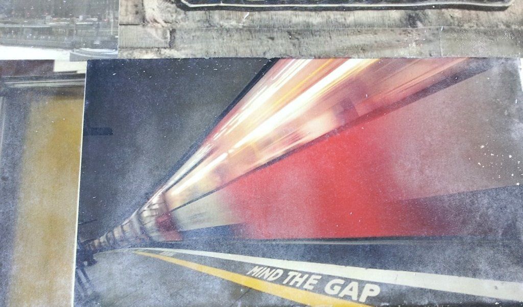 Bei dem Bild London [120 x120 cm] wurde nebst der Foto Transfer Technik ebenfalls mit Pinsel und Farbe sowie mit schwarzer Tusche gearbeitet. Die Herausforderung bestand hier, die einzelnen Foto-Tansfer so aneinander zu Reihen, dass keine Lücken zwischen den jeweiligen anstossenden Bilder entstehen. Das fertige Transfer Bild wurde danach, noch an einzelnen Stellen, mit SW- & Farb-Fotos ergänzt welche zu dem jeweiligen Abbild passen.