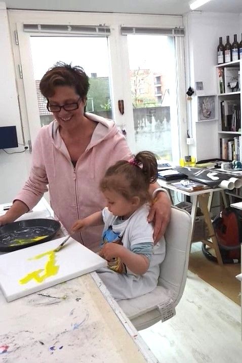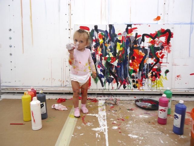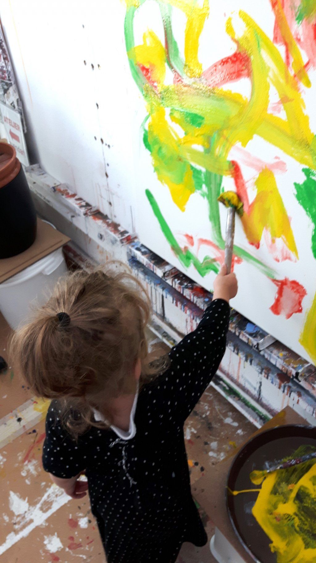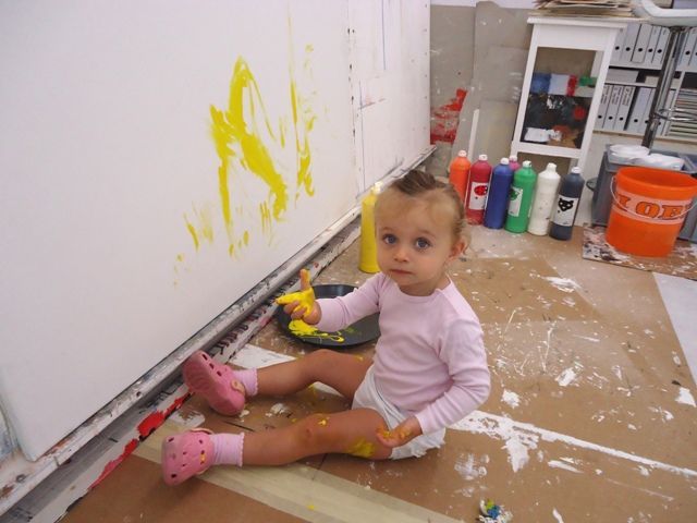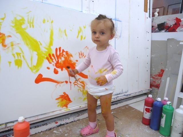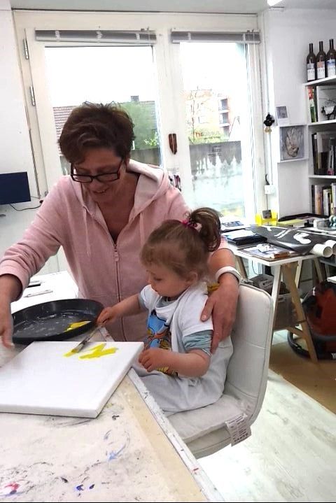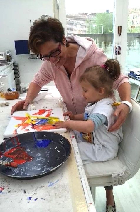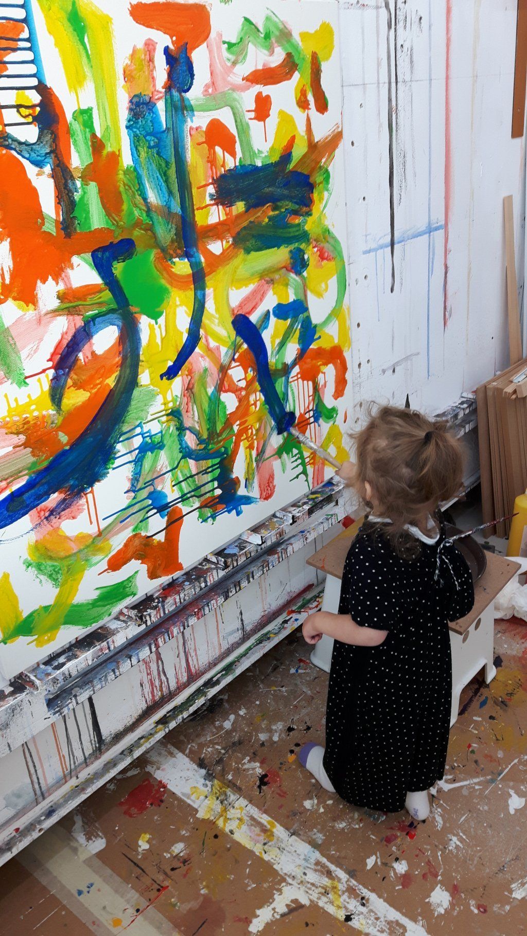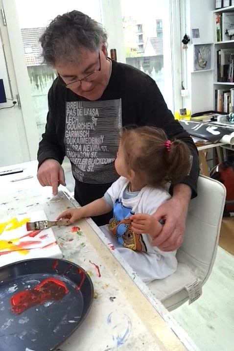 Meine beiden Enkelinen nahm ich deswegen, schon als ein Jährige, des öfters mit in mein Atelier. Dort stand Ihnen sehr viel Platz zur Verfügung und Sie konnten dort, ohne Angst etwas zu verkleckern oder zu vermalen, aus Lust und Laune, schmieren, pinseln, spachteln, kritzeln, tupfen und kleben. Im Atelier Umfeld konnten Sie somit Ihrer Kreativität freien lauf lassen und auf spielerische art uns ihre Bildsprache vermitteln.