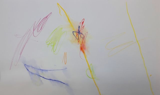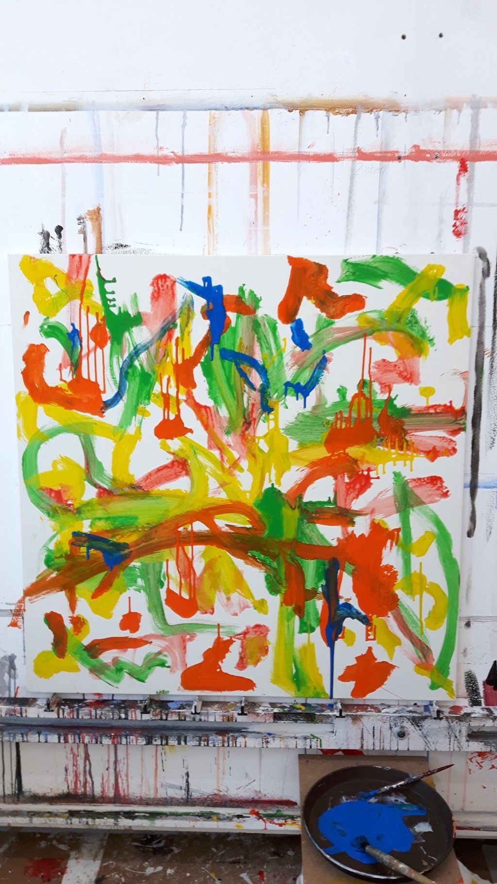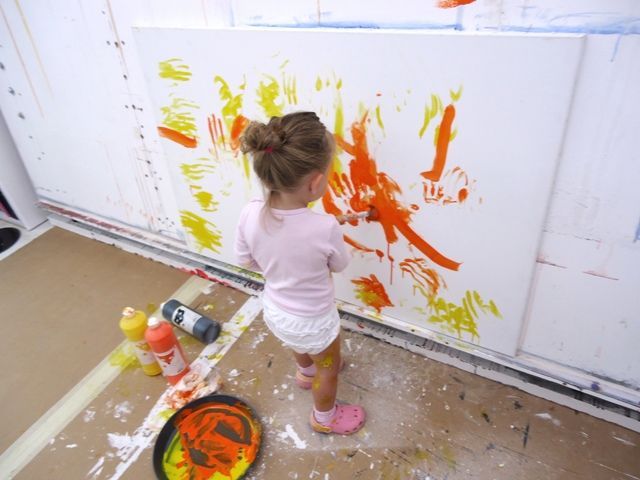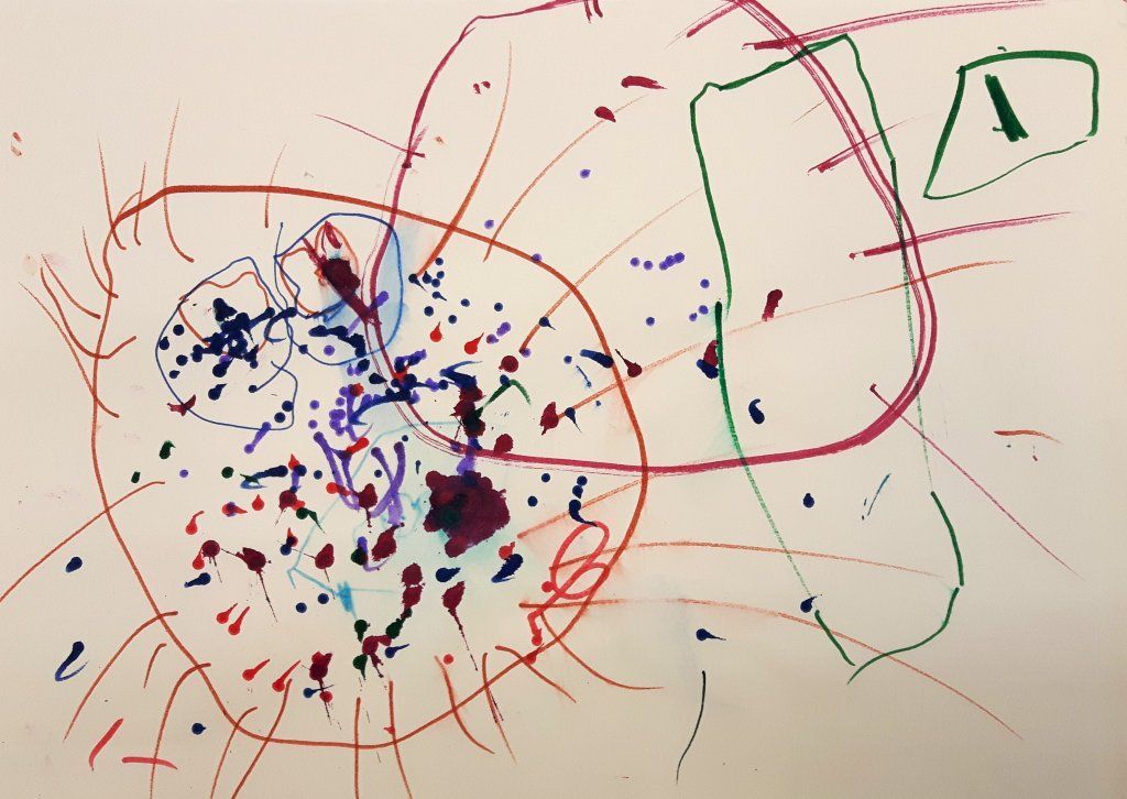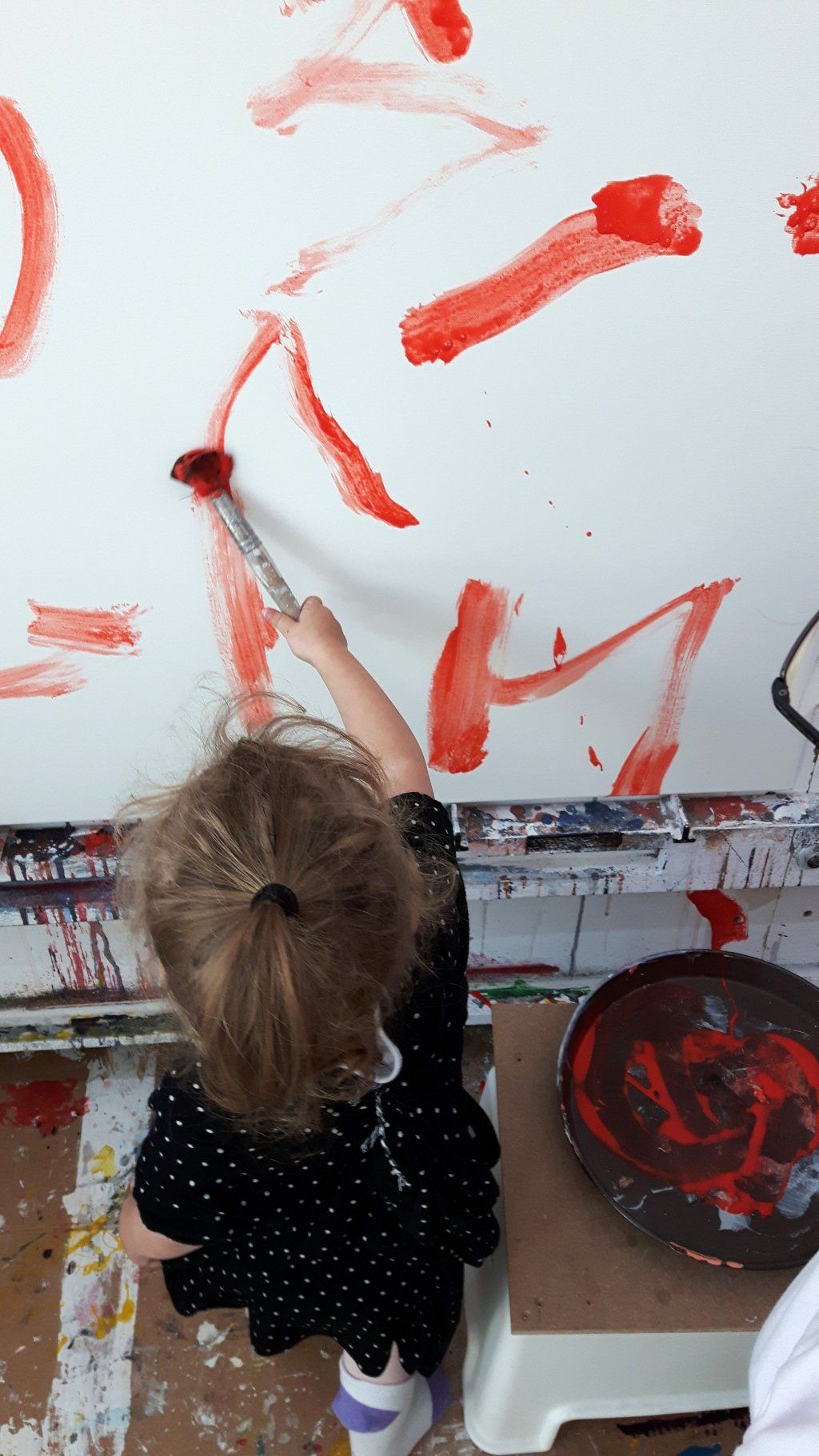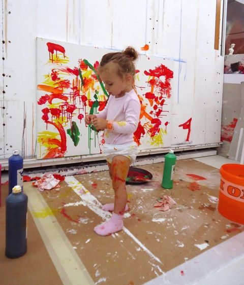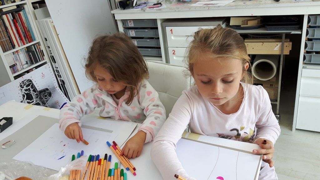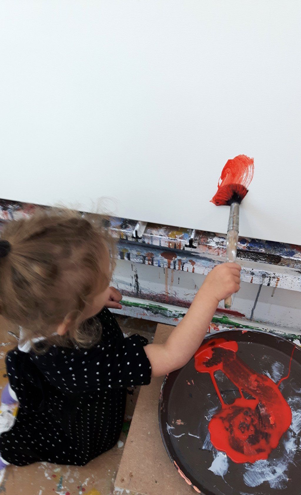 Meine beiden Enkelinen nahm ich deswegen, schon als ein Jährige, des öfters mit in mein Atelier. Dort stand Ihnen sehr viel Platz zur Verfügung und Sie konnten dort, ohne Angst etwas zu verkleckern oder zu vermalen, aus Lust und Laune, schmieren, pinseln, spachteln, kritzeln, tupfen und kleben. Im Atelier Umfeld konnten Sie somit Ihrer Kreativität freien lauf lassen und auf spielerische art uns ihre Bildsprache vermitteln.